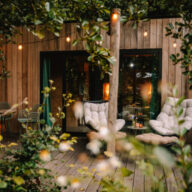 Ons tweede huisje “Forest Green’” staat onder de grote Els. Deze mooie boom zorgt voor veel natuurlijke schaduw en heel veel vogeltjes boven je vlonder. Groen is dan ook de basiskleur in het interieur